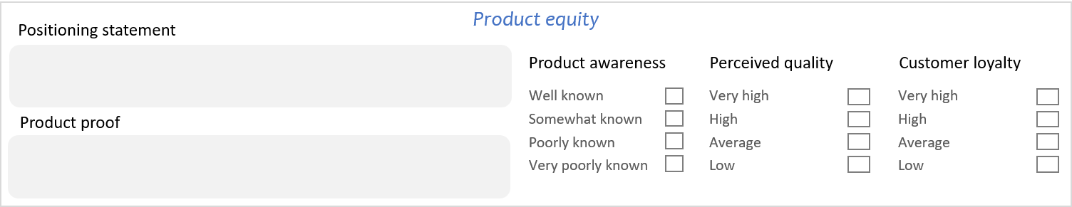 This part of the canvas covers Product Equity. This is the measure of the perceived value of a product. This includes its functionality, quality and performance.